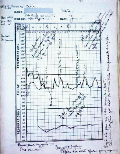 クッシングはエーテル麻酔を実施するとき、患者の状態を継続的に監視し、異変を未然に察知する方法を考えられないか、同期の研修医コドマンに相談した。患者の状態を反映するのは、バイタルサインだ。術前から術中・術後まで、一定時間ごとに体温・脈拍・呼吸数を指標として測り、「エーテルチャート」 としてグラフを書き込んでいけば、患者の状態を把握できるし、結果として手術時の死亡を減らせるだろうという点では、二人の意見は一致した。